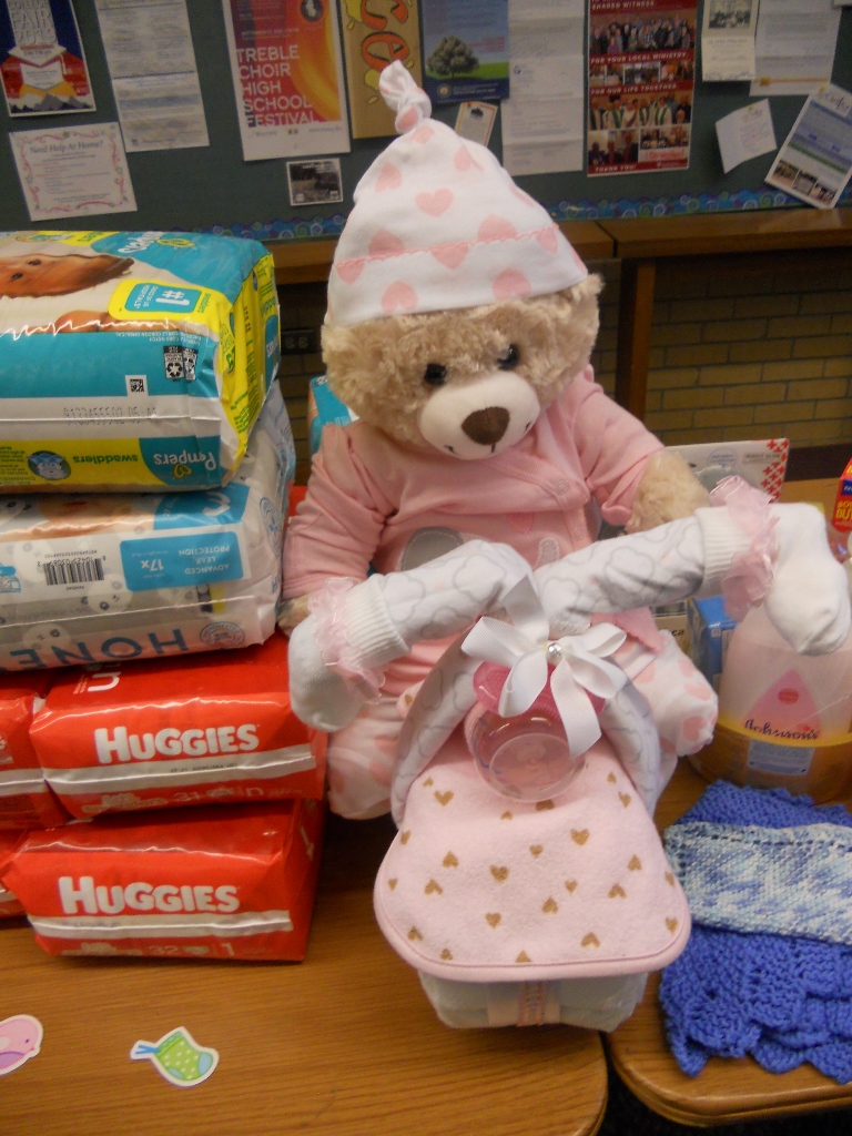 Donations from the members are abundant and once again Robin Engelberg will be joining us at the day meeting to tell us about the program and to accept our gifts. Below are photos of the 2019 donations and the shower ‘diaper’ bear made by one of our members daughters.