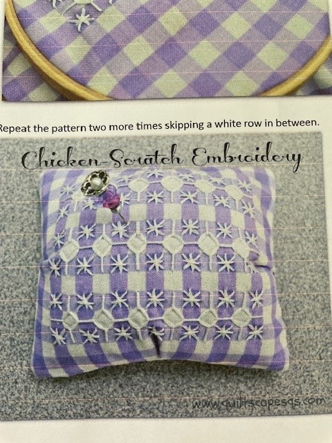 Members can choose from a variety of Gingham check fabric (cut to the size the they want). A variety of patterns will be available. Members will provide embroidery hoop/#24 Tapestry or #7 or #8 Crewel needle (member choice). Night Group will have same Program.